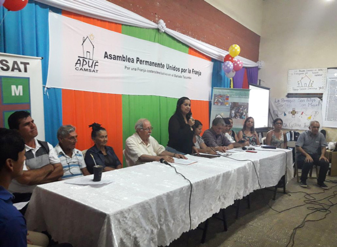 Pero además, hace año y medio se inició otra organización que se llama Apuf (Asamblea Permanente Unidos por la Franja). Y aclara el padre: «Se creó justo cuando empezó este proyecto y ahí estamos 33 organizaciones. Estamos asociaciones vecinales, asociaciones gremiales, asociaciones deportivas, 4 iglesias evangélicas, la iglesia católica, la misma Camsat». Explicó asimismo el padre Velasco que estas 33 organizaciones tienen su asamblea, su junta ejecutiva. Es así que cuando este sacerdote dice algo, lo está diciendo en nombre de esas 33 organizaciones. «Es decir, yo creo que en este momento estamos representando fácilmente al 80-90% del barrio», aclaró. Al momento de la entrevista, estaban previstas 16 reuniones en 16 zonas del Bañado Tacumbú informándole a todo el barrio sobre estos cambios. «Es decir, que el barrio se entera porque tuvimos esta organización. Es una organización muy fuerte, muy respetada». El padre refiere que en la última asamblea de la Apuf eran como 100 representantes del barrio. «No eran 100 personas que vinieron y se sentaron ahí… cada una de esas organizaciones tiene 3 representantes oficiales. Si vienen todos, serían 120, pero solemos estar de 80 a 100 y son 100 representantes. Entonces, yo cuando hablo, hablo en nombre del barrio. Por eso, muchas veces cuando nos llaman a Senavitat, yo me voy con la coordinadora de la Apuf, que es una maestra que se llama Angélica Viveros, y con la coordinadora del Camsat. Y cuando me piden que yo diga algo oficial yo digo que no, que primero yo tengo que hablar con Camsat y Apuf».
