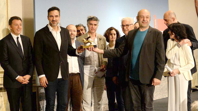 Los curadores del pabellón del España, arquitectos Iñaqui Carnicero y Carlos Quintáns sosteniendo el León de Oro, acompañados por los arquitectos de la muestra Unfinished, por el primer ministro Matteo Renzi y por Alejandro Aravena.
