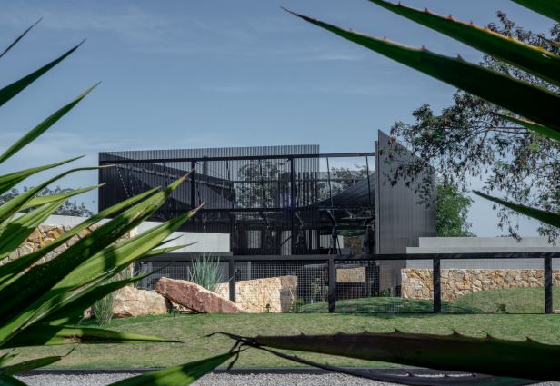 Acceder a esta casa es atravesar micro colinas de césped, muros de piedra, paños de vidrio velados por una armadura traslúcida.