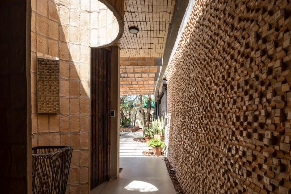 El ladrillo altera su condición de muro. Se lo presenta vertical macizo, de residuos cerámicos y ondulado como superficie reglada autoportante en las paredes. El ladrillo resuelve no solo la delimitación del espacio como plano perpendicular a la línea de tierra sino también paralela a ella.