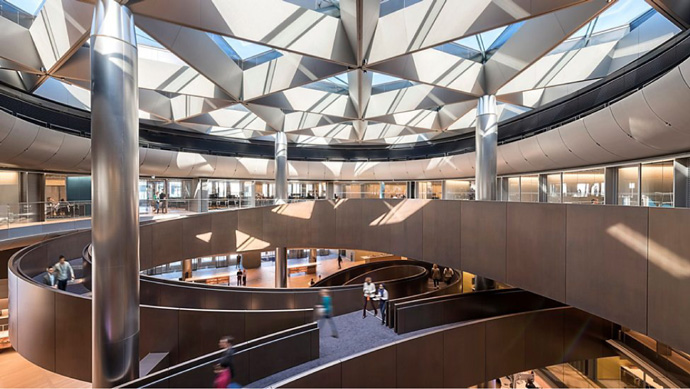 “El nivel de la explanada es muy vibrante, bullicioso de actividad y aislado de su entorno. Es aquí donde comienza a surgir el verdadero éxito del proyecto. Dondequiera que mire hay un detalle inventivo, desde el techo de aluminio doblado a modo de pétalos de rosa hasta las tablas magnéticas del piso. El objetivo del edificio era evitar el espacio de oficina estándar y en esto tiene éxito”, señala el jurado y añade: “En general, el proyecto es un tour-de-force. Esto es lo opuesto a un edificio silencioso y discreto. De hecho, la multiplicidad de la invención en numerosos niveles se lleva a cabo con la convicción de que no puedes fallar, sino quedarte impresionado”.