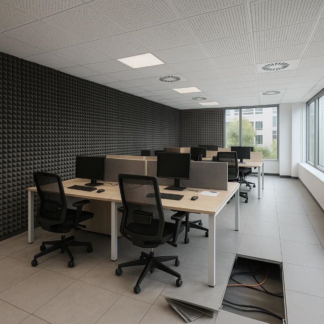 Uno de los productos destacados es el revestimiento acústico de espuma de poliuretano, diseñado para absorber el sonido. Su aplicación permite reducir la reverberación y los ruidos no deseados, creando espacios propicios para la concentración y el trabajo en equipo. Es una solución ideal para oficinas abiertas, salas de reuniones y call centers. Además, su instalación es sencilla y adaptable a distintos estilos arquitectónicos.